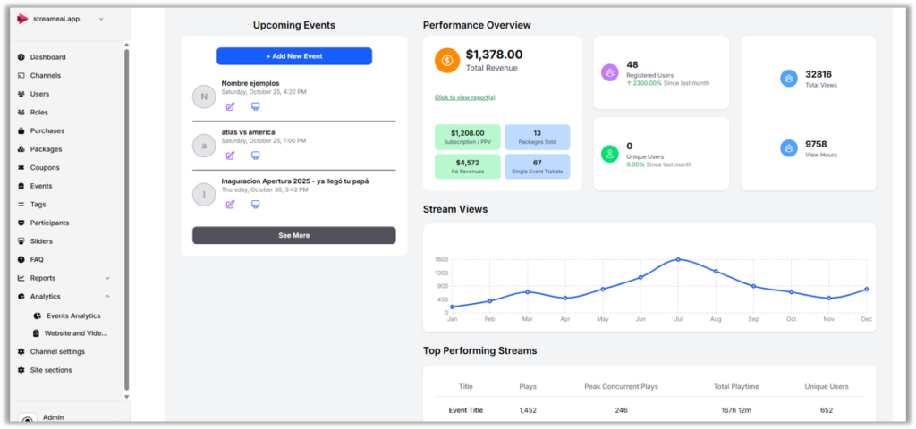 StreamEAI’s built-in analytics give you a complete view of your performance across video, web, advertising, and revenue. Filter and compare top-performing streams, track engagement by sport or category, and uncover insights that help you grow your audience and optimize monetization.Â